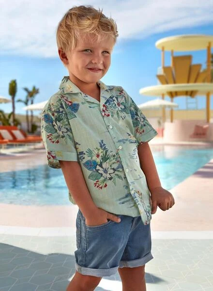 Bermuda en jean Mayoral. Tissu doux. Lavage moyen. Légèrement usé. 5 poches. Fermeture éclair et bouton. Étiquette de la marque à l’arrière. Better Cotton.
