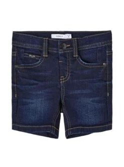Bermuda Name It. Modèle Sofus. Couleur bleu foncé. Tissu denim extensible. Fermeture par bouton pression. Cinq poches. Coutures contrastées. Taille ajustable.