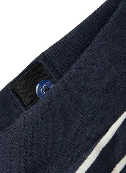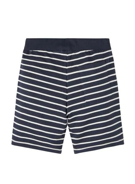 Bermudas Name It Couleur marine. Impression blanche Rayures. Taille avec élastique réglable. Cordon fixe. Poches sur les côtés.