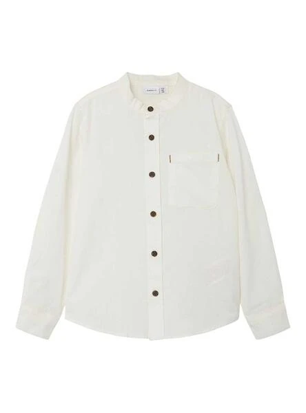 Chemise Name It. Modèle Fish. Couleur blanche. Manche longue. Col Mao. Fermeture avant avec boutons. Poche poitrine. Poignets boutonnés.