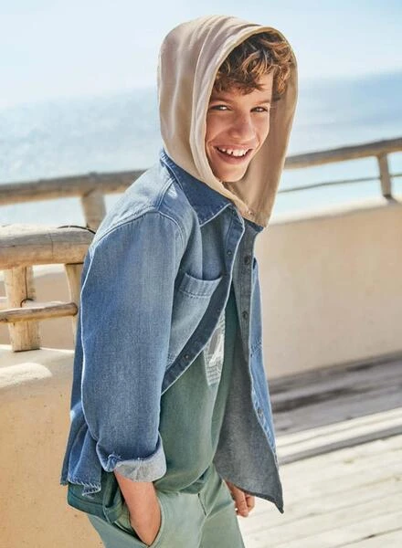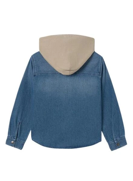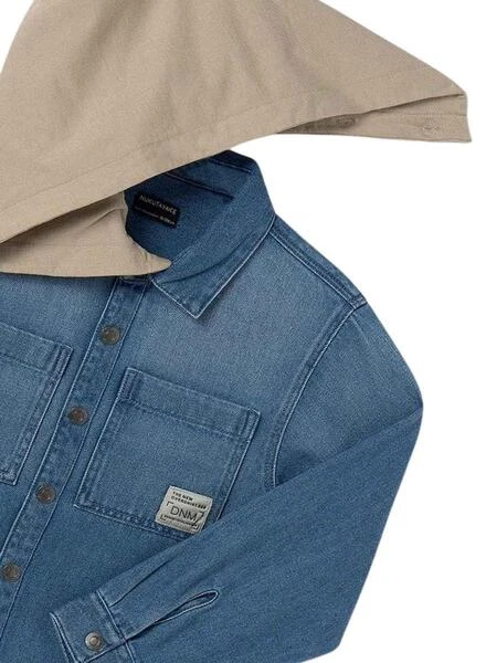 Chemise Mayoral. Modèle en denim. Couleur bleue. Fermeture à boutons. Capuche amovible. Deux poches poitrine. Manches longues.