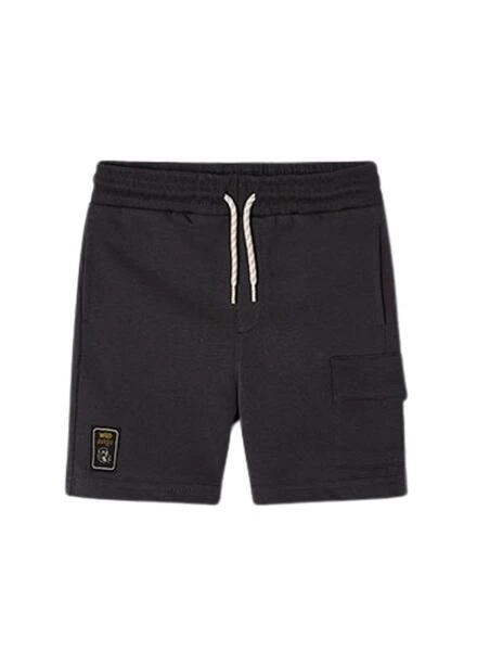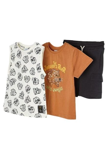 Ensemble Mayoral. 3 pièces. T-shirt orange à manches courtes. Imprimé sur le devant. Col rond. Débardeur blanc. Imprimé animal. Bermuda gris. Poches de type cargo. Poches à la taille. Taille élastique ajustable avec des cordons.