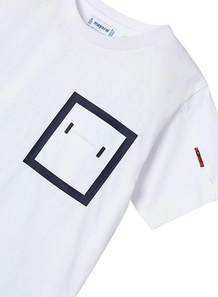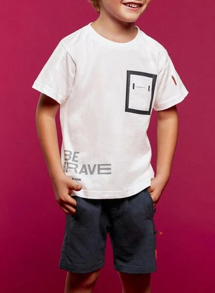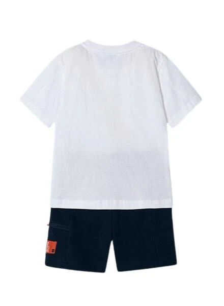 Ensemble Mayoral. 2 pièces. T-shirt blanc. Col rond. Manches courtes. Message imprimé à l’avant. Poche poitrine. Bermuda marine. Poches latérales. Poche avec fermeture éclair sur un côté. Étiquette cousue sur la poche.