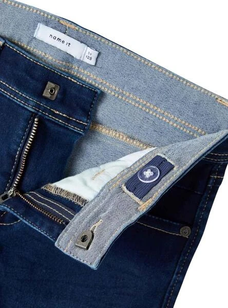 Jeans Name It. Slim fit. Couleur bleu foncé. Taille ajustable avec élastique. Cinq poches. Passants de ceinture pour . Fermeture éclair et crochet à la taille.