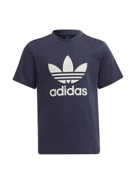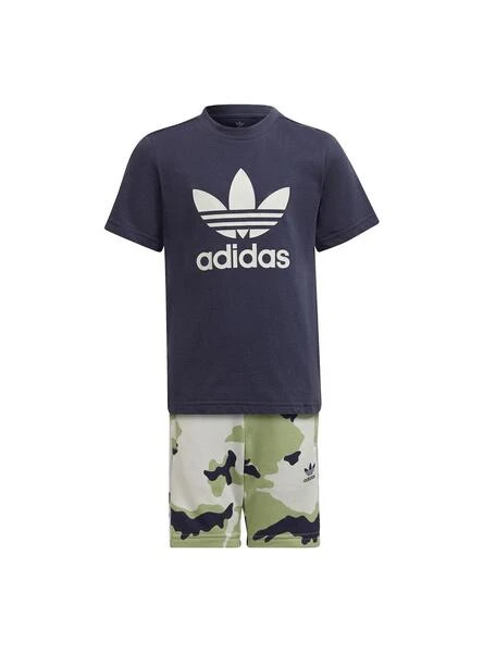 Adidas Set. T-Shirt marine. Manche courte. Col rond. Logo trèfle blanc sur la poitrine. Pantalon avec taille élastique réglable. Imprimé camouflage. Poches latérales. Logo de couleur marine.