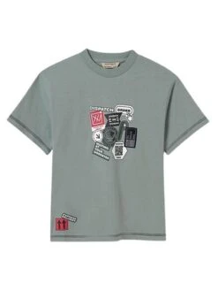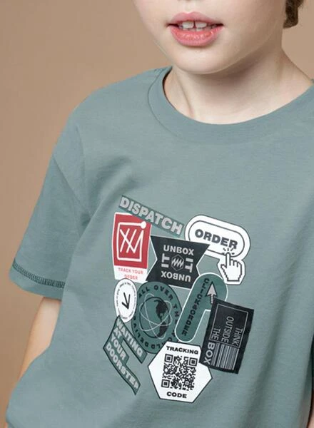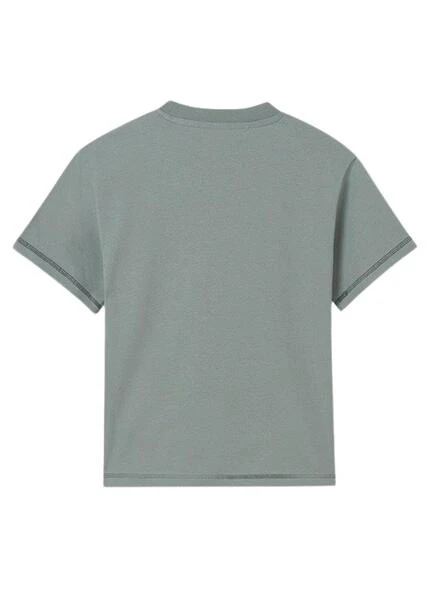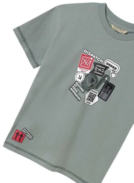 T-shirt Mayoral. Couleur verte. Encolure ronde. Manches courtes. Coutures décoratives. Autocollants imprimés sur l’avant. Épaules tombantes.