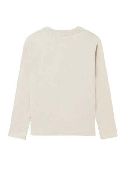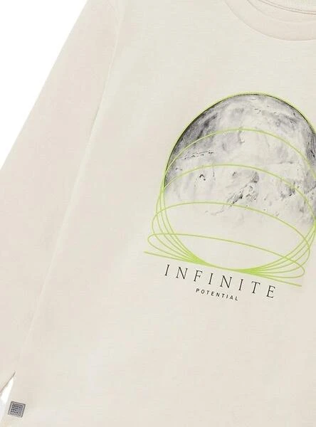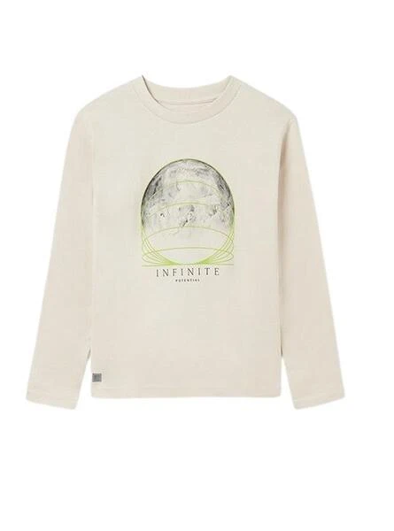 T-Shirt Mayoral. Beige. Impression d’un univers avec un message infini. Petite étiquette au bas de la chemise. Col rond. Manche longue. Cannelé aux extrémités.