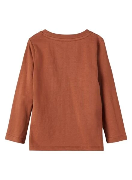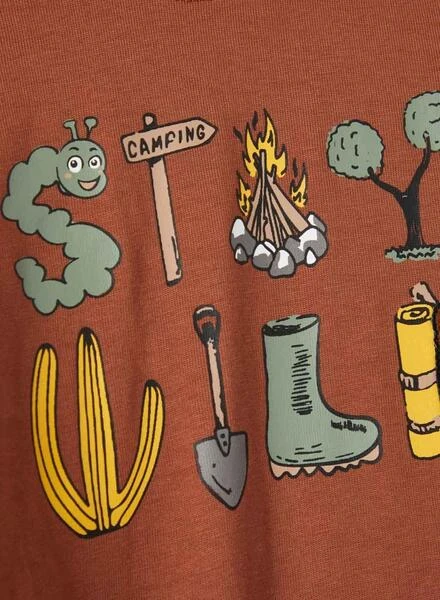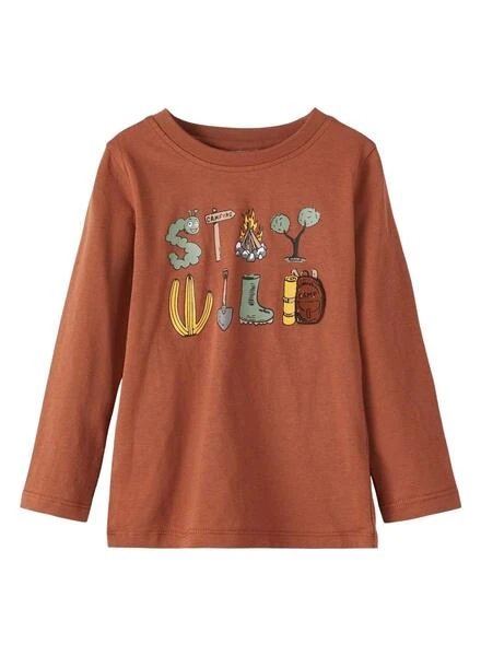 T-Shirt Name It. Modèle de bordure. Couleur rouge. (Coquille de noix de coco). Col rond élastique. Phrase imprimée sur la poitrine « Stay Wild ». longue couverture